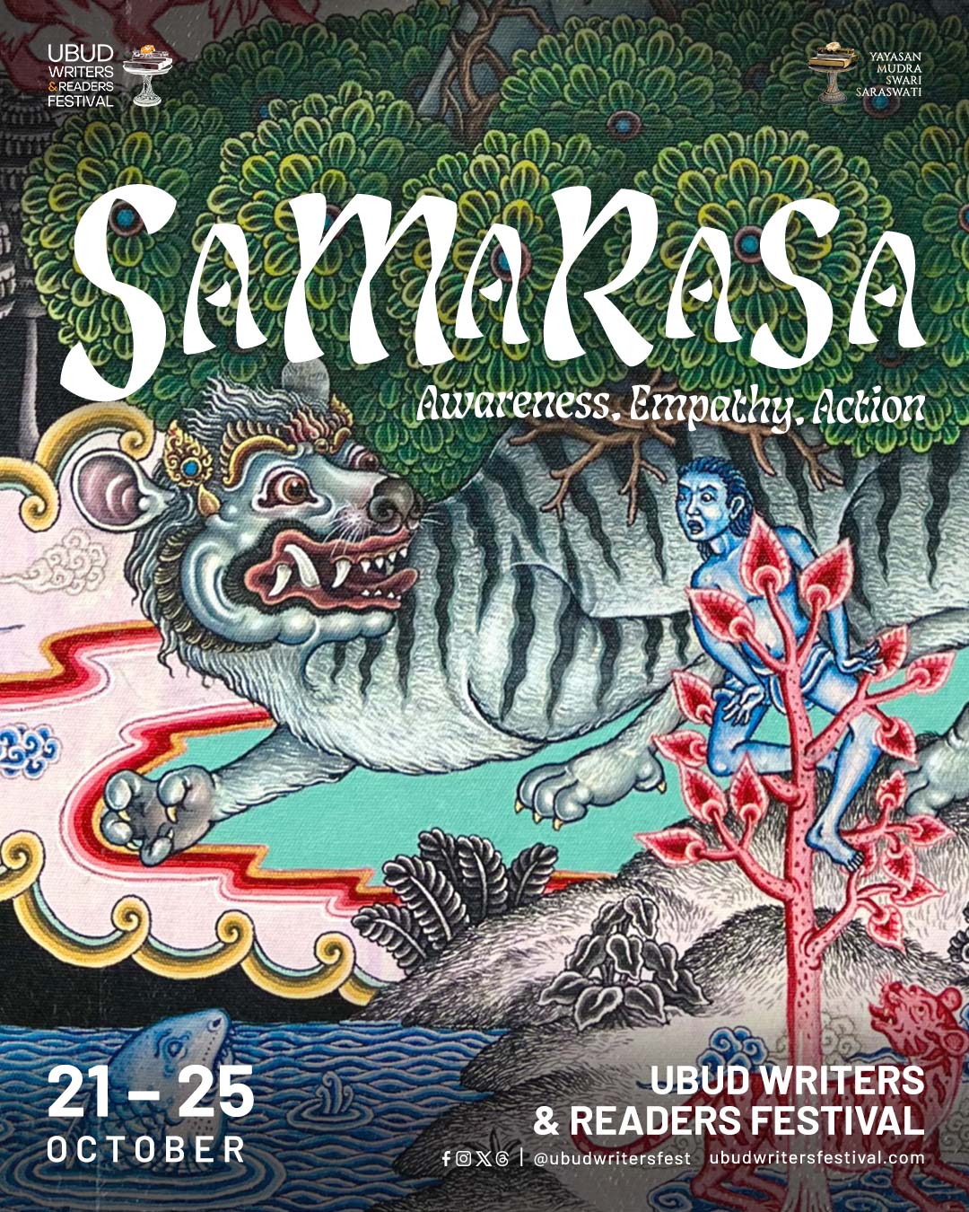 We are also thrilled to reveal this year’s artwork by Balinese artist Wayan Aris Sarmanta, a young talent whose work originates from his hometown’s Batuan painting style. I hope you can become tangled up in the unified image of mythical creatures and landscapes he has created.